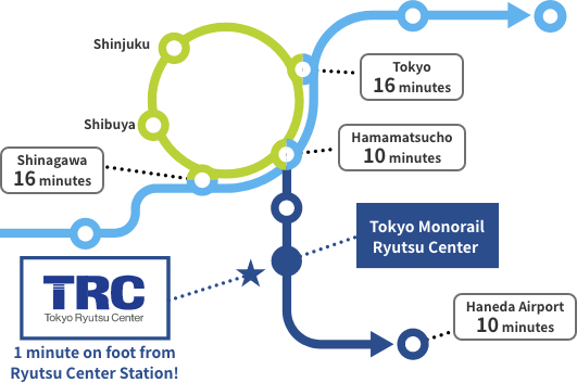 The trip from Hamamatsucho Station or Haneda Airport to Ryutsu Center Station by Tokyo Monorail takes only around 10 minutes, and TRC can be reached from Tokyo Station or Shinagawa Station via Hamamatsucho Station in just over 15 minutes. The location offers convenient access not only from the Tokyo Metropolitan Area, but also to visitors from other regions arriving by bullet train or airplane, improving convenience for all related parties and contributing largely to attracting visitors. -